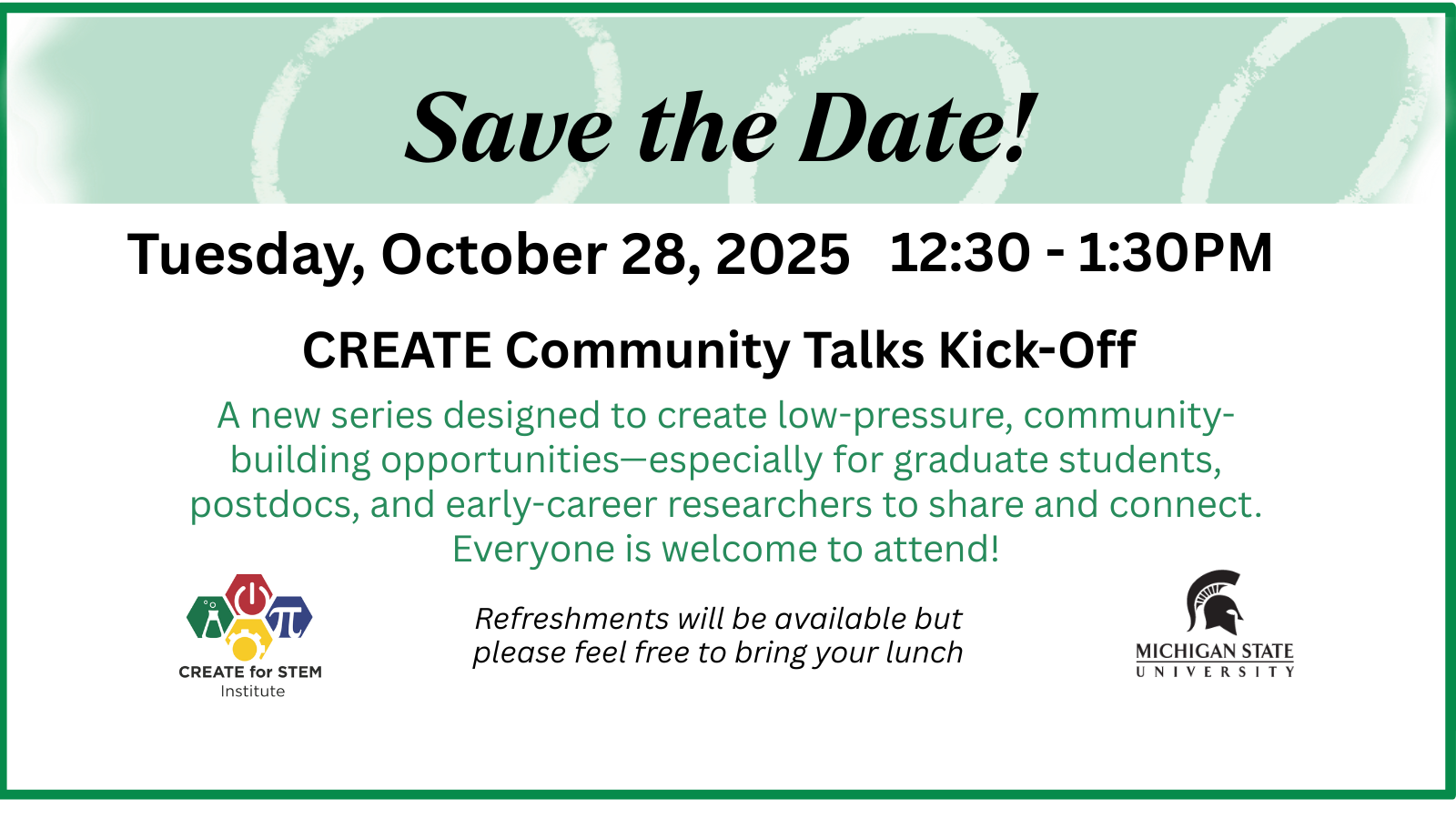 We’re excited to invite you to the first CREATE Community Talk, a new seminar series designed to foster connection, collaboration, and conversation across the STEM Education research community at MSU.