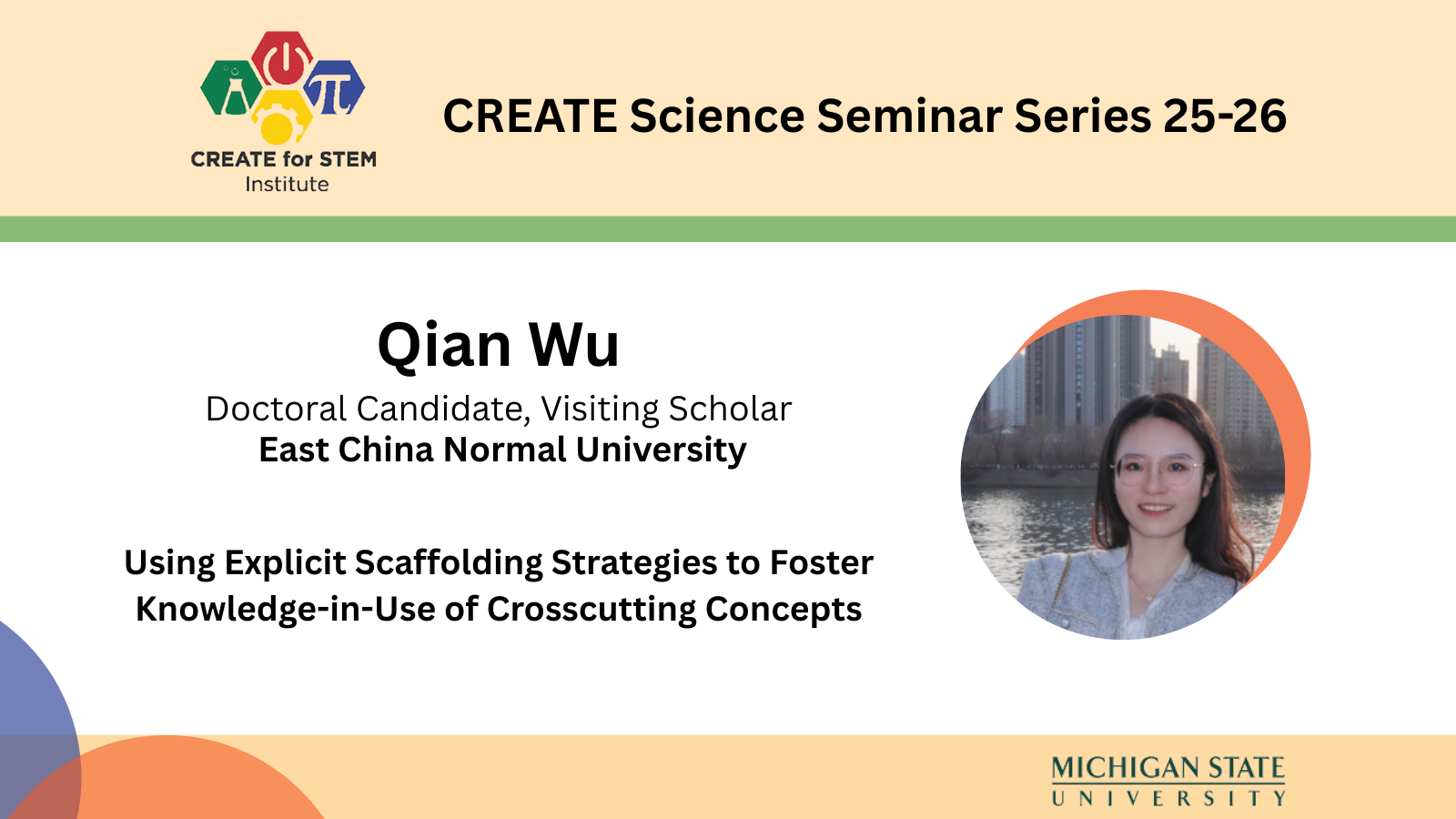 Qian is a visiting scholar working with Dr. Joe Krajcik. She is currently a doctoral candidate in Curriculum and Instruction (Science Education) at East China Normal University. She holds an M.Ed. in Curriculum and Instruction from Beijing Normal University and a B.S. in Chemistry from Tianjin Normal University. Qian’s research focuses on innovative, interdisciplinary approaches to science teaching and learning. She is skilled in using quantitative research methods and is committed to advancing research-based instructional practices in K–12 science education.